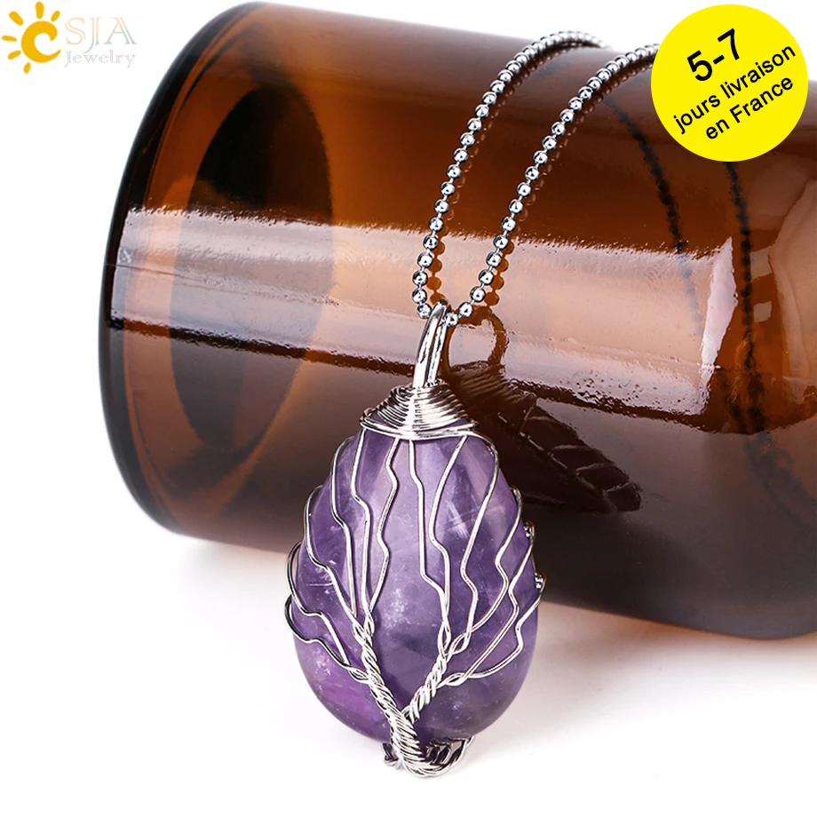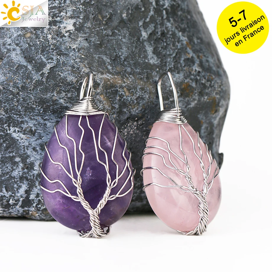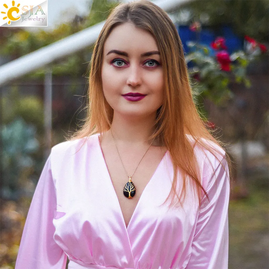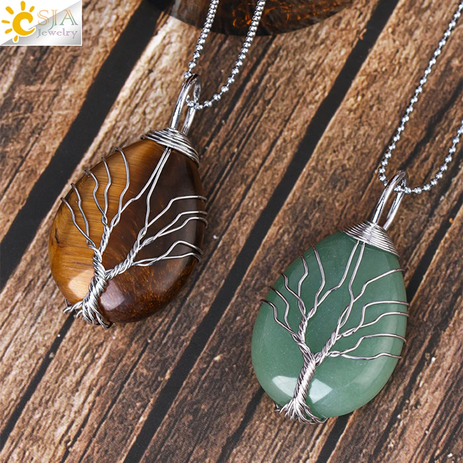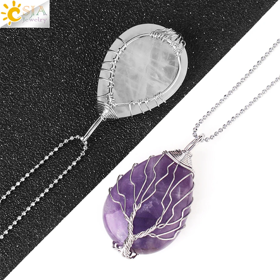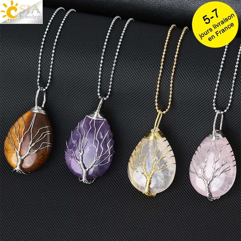 CSJA Tree of Life Crystals Necklace Pendant Water Drop Natural Stone Necklaces Wire Wrap Rose Amethysts Quartz Tiger Eye G953 |